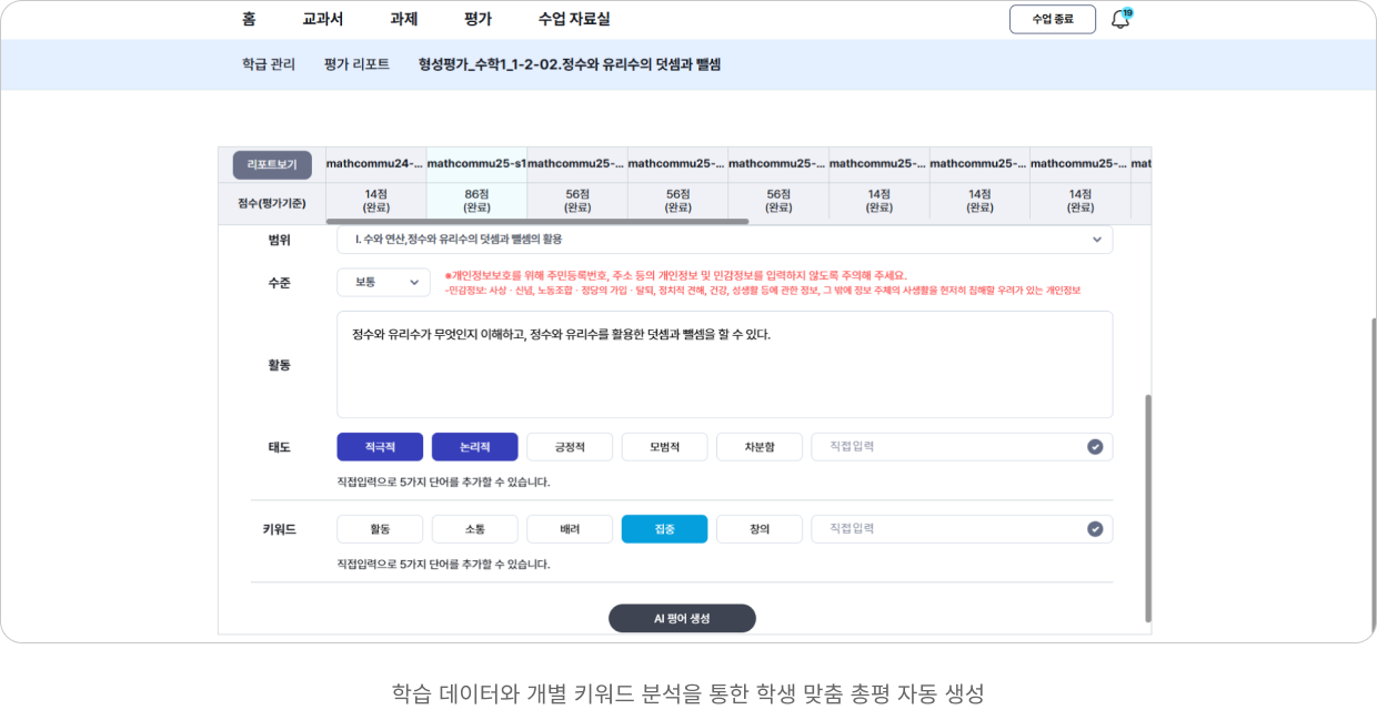 - AI 평어 기능은 학생의 학습 데이터와 개별 키워드를 분석하여 학생 맞춤 총평을 자동으로 생성해줘요.