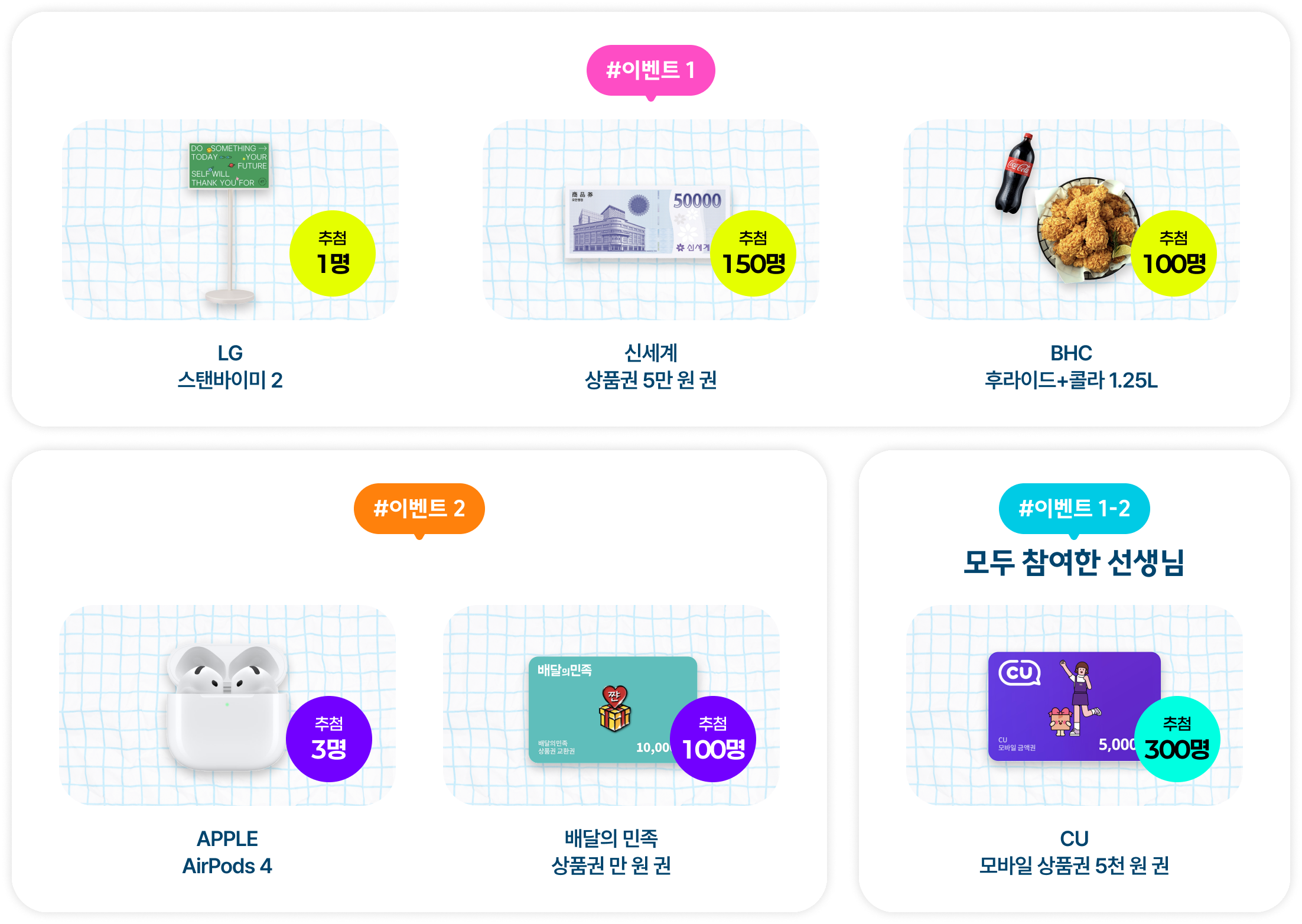 - 이벤트 1은 회차별로 1인 1회, 이벤트 2는 1인 1회 참여하실 수 있습니다.