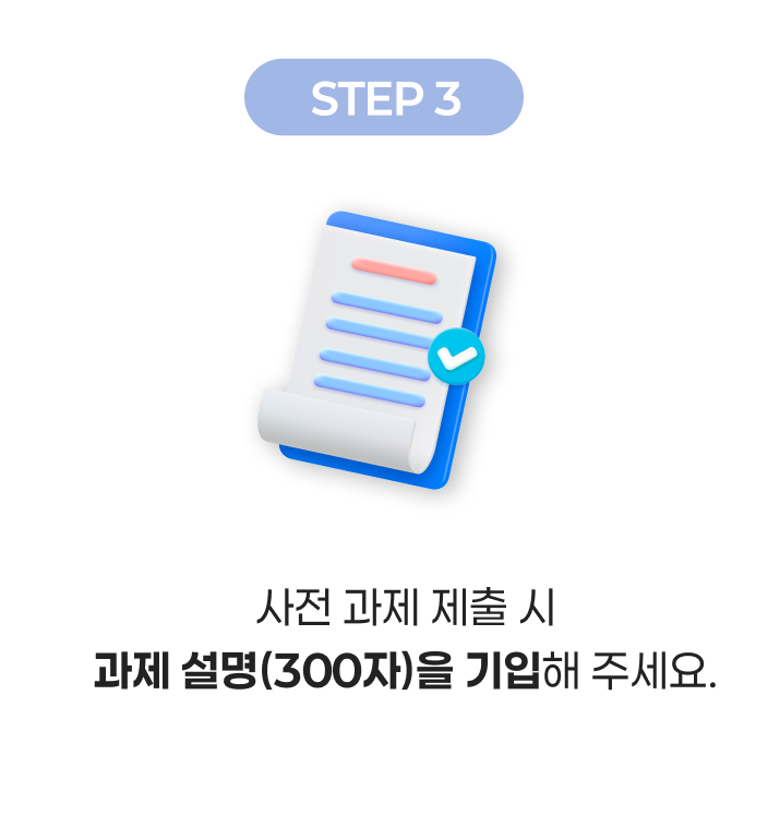 ※ 이메일로만 제출하실 경우 접수가 누락될 수 있으므로, 하단 <접수하기>를 통해 과제 설명을 꼭 제출해 주세요!
