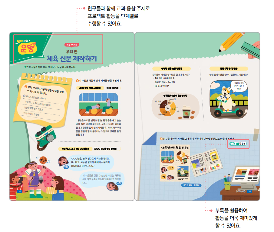 국어 교과와 연계해 체육 신문 만들기 등의 융합 주제로 활동을 수행하고,
