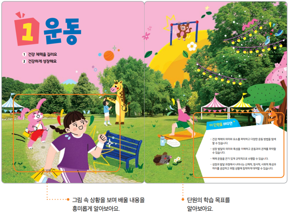 비상교육 체육 교과서는 소단원을 재미있게 시작하도록 캐릭터가 있는 한 컷의 그림으로 배울 내용을 담았는데욥.