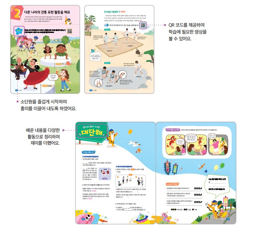 QR 코드를 제공하여 학습에 필요한 영상을 볼 수 있고 재미를 더할 수 있도록