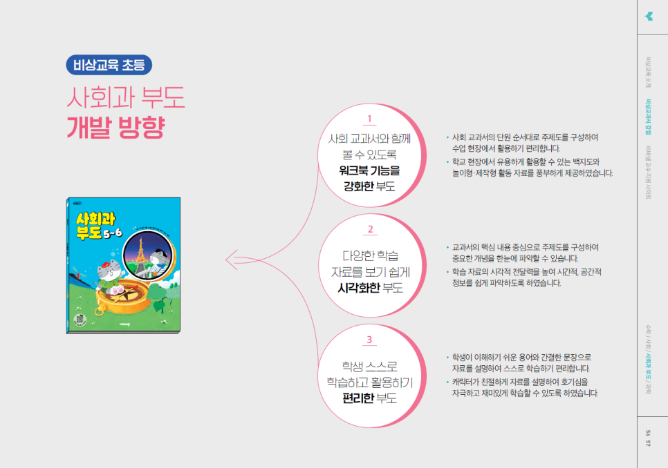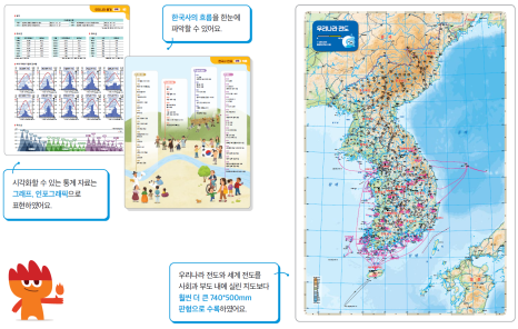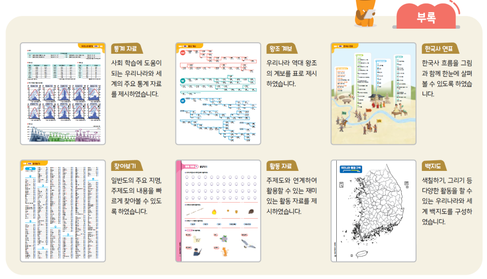 1. 사회 교과서와 함께 볼 수 있도록 워크북 기능을 강화한 부도 2. 다양한 학습 자료를 보기 쉽게 시각화한 부도 3. 학생 스스로 학습하고 활용하기 편리한 부도