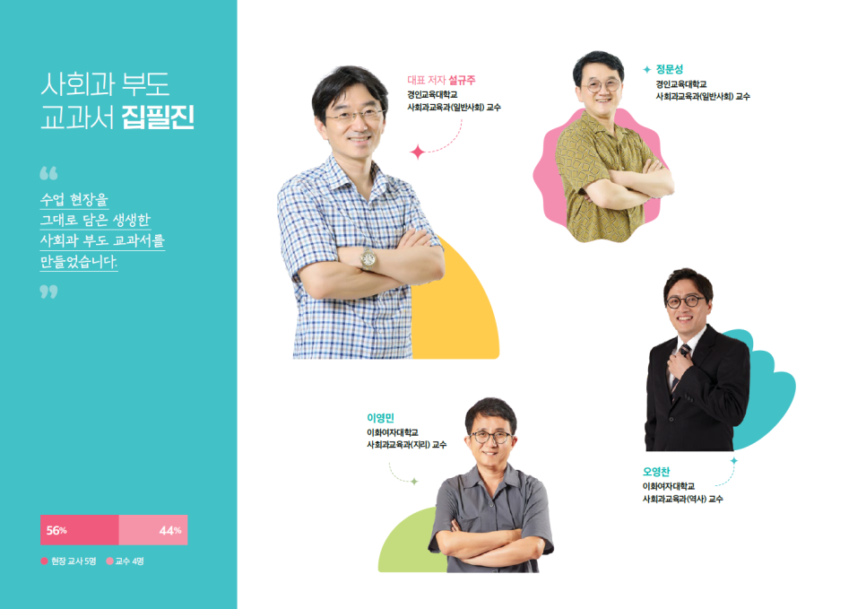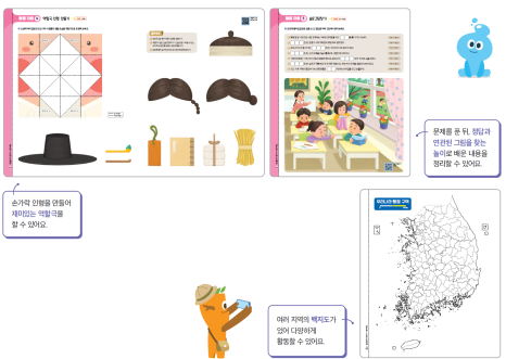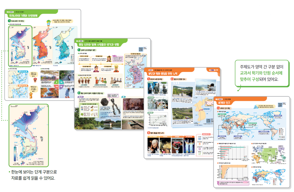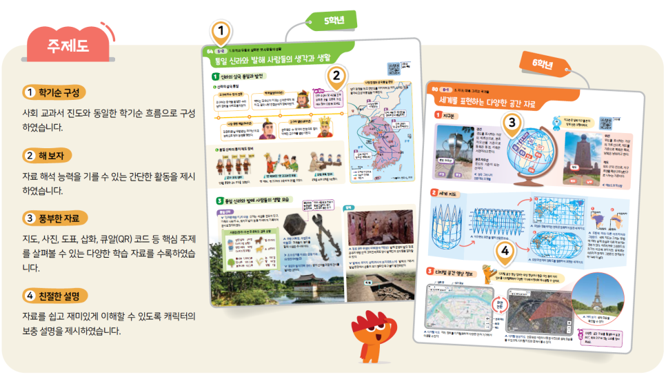 주제도는 사회 5학년, 사회 6학년으로 나누어 편성하였어욥. ① 학기순 구성 사회 교과서 진도와 동일한 학기순 흐름으로 구성하였습니답. ② 해 보자 자료 해석 능력을 기를 수 있는 간단한 활동을 제시하였습니답. ③ 풍부한 자료 지도, 사진, 도표, 삽화, 큐알 코드 등 핵심 주제를 살펴볼 수 있는 다양한 학습 자료를 수록하였습니답. ④ 친절한 설명 자료를 쉽고 재미있게 이해할 수 있도록 캐릭터의 보충 설명을 제시하였습니답.