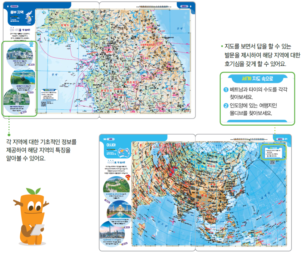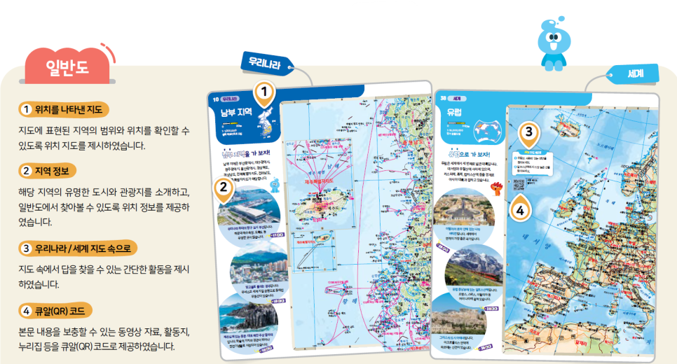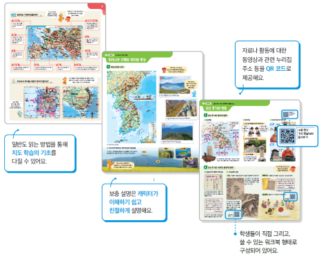 ① 위치를 나타낸 지도 지도에 표현된 지역의 범위와 위치를 확인할 수 있도록 위치 지도를 제시하였습니답. ② 지역 정보 해당 지역의 유명한 도시와 관광지를 소개하고, 일반도에서 찾아볼 수 있도록 위치 정보를 제공하였습니답. ③ 우리나라/세계 지도 속으로 지도 속에서 답을 찾을 수 있는 간단한 활동을 제시하였습니답. ④ 큐알(QR)코드 본문 내용을 보충할 수 있는 동영상 자료, 활동지, 누리집 등을 QR코드로 제공하였습니답.