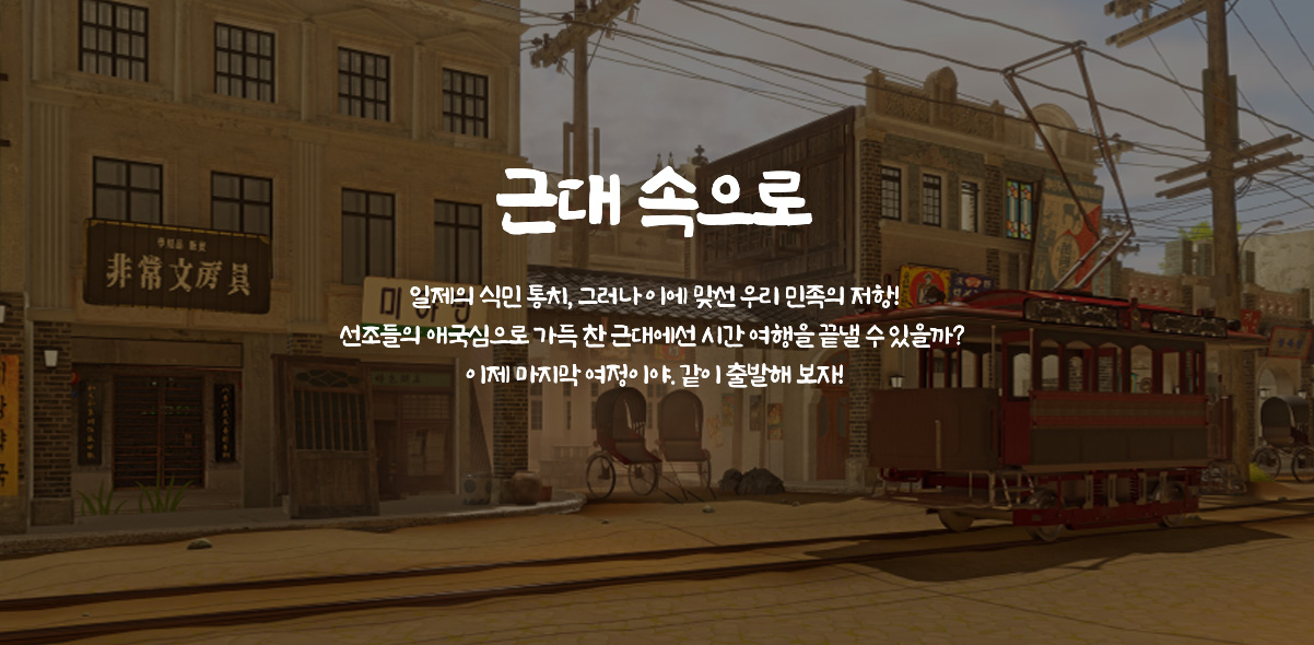 일제의 식민 통치, 그러나 이에 맞선 우리 민족의 저항! 선조들의 애국심으로 가득 찬 근대에선 시간 여행을 끝낼 수 있을까? 이제 마지막 여정이야. 같이 출발해 보자!
